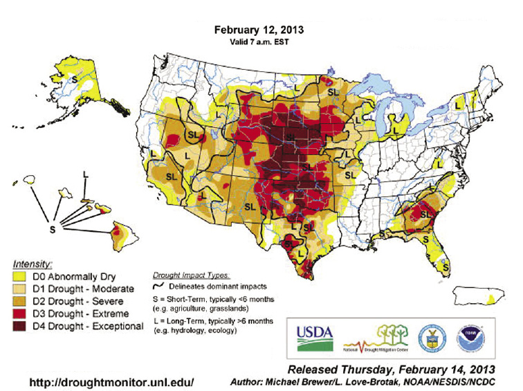 As of mid-February 2013, the U.S. National Weather Service foresees no heavy rains or snowfall on the way, sufficient to relieve the drought in the North American farmbelt. The drought jeopardizes Winter wheat, reduces the soil moisture needed for corn and soy, worsens the acute hay and pasture scarcity, and threatens the entire livestock feed chain (Figure 1). There are no food reserves. This situation constitutes a world disaster threat. However, the impact of another “unlucky” crop season does not define the problem. Even if miracle weather now ensues, the crisis remains.