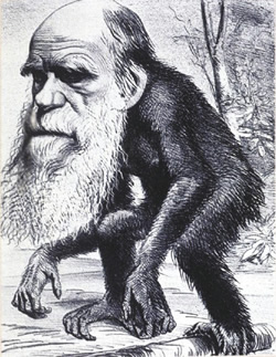 became a leader of the eugenics movement; Richard Dawkins lectures on “The God Delusion”; a contemporary cartoon of Charles Darwin, whose principal promoter was Thomas Huxley. |