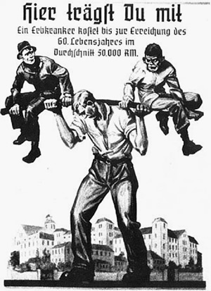 ![]() A euthanasia poster in Germany before Hitler took power: “Look who you’re carrying. One person with birth defects, over 60 years, costs an average of 50,000 Reichsmarks.” Dawkins is no different. |