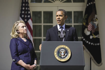 President Barack Obama, with Secretary of State Hillary Rodham Clinton, Sept. 12, 2012, delivers a statement regarding the attack on the U.S. consulate in Benghazi, Libya. |