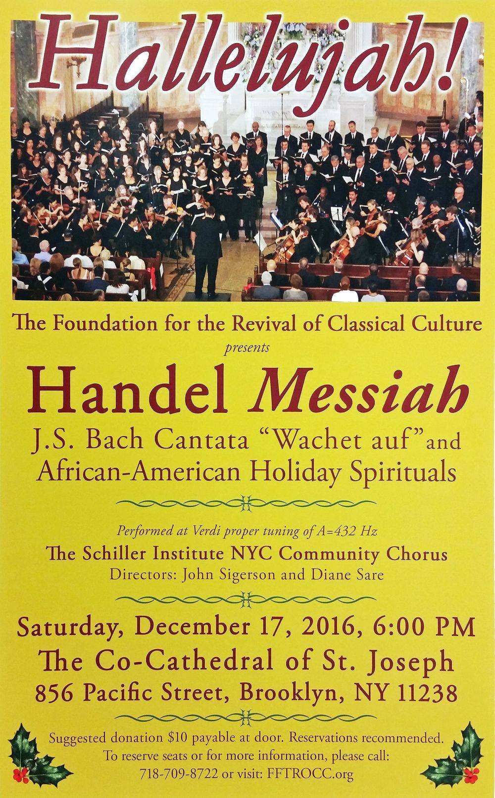 The Schiller Institute New York Community Chorus is proud to announce its participation in "A Holiday Concert for Unity," to be held at the Co-Cathedral of St. Joseph in Brooklyn on Saturday, December 17 at 6:00 PM. The concert is sponsored by the Foundation for the Revival of Classical Culture. The program will consist of the "Christmas" section of Handel's great oratorio, Messiah, the "Wachet Auf" cantata by Johann Sebastian Bach, and African-American Christmas Spirituals.