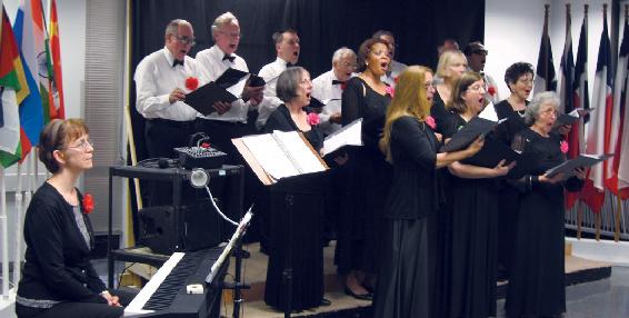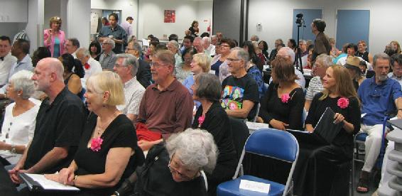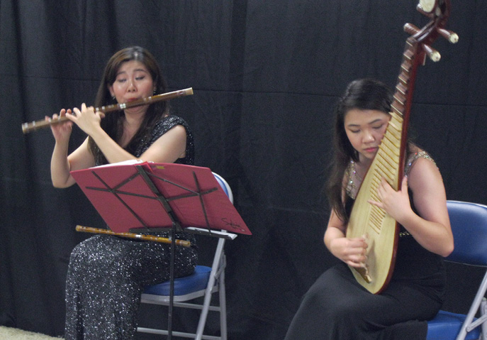 The second half of the program opened with Arturo Domingo giving an operatic treatment to another Mexican composition, “Dime que si,” riveting attention of the gathering. With his own “cheering section” of friends, he further livened up the on-going interaction of musicians and audience. Domingo was followed with an introduction to the traditional music of China, by Sylvia Yan, Francine Di, and Amanda Cheung, members of the ensemble Eastern Echo. They performed—on Dizi, keyboard, and Pipa respectively—the well known “Molihua” (Jasmine Flower) and “Song Ni Yi Zhi Meigui Hua” (Send Me a Rose), an intriguing folk song from Xinjiang province (Xinjiang Uyghur Autonomous Region) with a real Silk Road feel. It featured the Pipa, a popular, plucked instrument which has been played for almost two thousand years in China. The keyboard-playing introduced a western aspect which was somewhat distracting in the first song, but the audience was delighted all the same, particularly by “Send Me a Rose,” and by the deep participation of these three talented Chinese-American musicians in the evening’s musical dialogue. Dorceal Duckens then followed, with “Didn’t My Lord Deliver Daniel?” arranged by the great African-American composer Harry Burleigh. Dorceal again established a real moral high ground with a beautiful and powerful performance. He then brought the Schiller Community Chorus back to the stage and led them in two Spirituals, “I’ve been ’Buked,” and “Deep River.” Then followed another spiritual, the chorus of Hebrew slaves, “Va Pensiero,” from Verdi’s opera Nabucco, which awed the audience into hushed participation. “The Lord Bless You and Keep You,” which Sylvia Olden Lee might consider a “white spiritual,” closed out the program, with a diverse group of audience members quietly singing along to themselves.