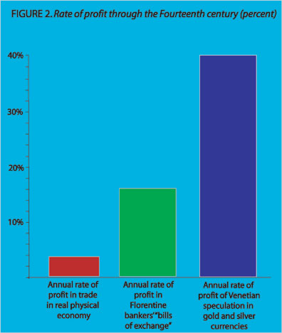 Then, in the middle of the fourteenth century, the whole system collapsed in a chain reaction of bankruptcy starting with the King of England discovering, by checking with his priest, that not only was usury a mortal sin, but that he, as the King of England, by continuing to pay his debts to usury, was actually contributing to the eternal damnation of the soul of his creditors. So, the King of England repudiated his debts to the Houses of Bardi and Peruzzi, which were Florentine-based, but they were key bankers of the period who had looted every part of Europe through this process.