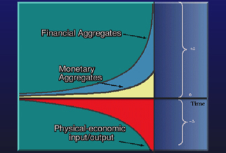 Now what happened with this change to a so-called consumer society, which is really an imitation of the degeneracy of Ancient Rome--change from a producer society to a consumer society? Well, what happened was we began to reduce, from about 1966 on, we began to reduce the per-capita physical output of our economy. We kept the economy going, how? By pouring money into the system, from the Federal Reserve and other sources, and from foreign sources, to pump up financial assets, and to give us the buying power to buy what we didn't produce from abroad.