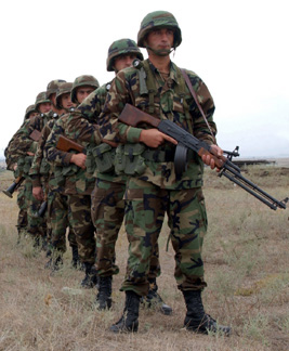 ![]() USAF/A1C Dallas D. Edwards Georgia has turned out to be a willing instrument of the Anglo-American strategy for encirclement of Russia. On Aug. 8, war broke out between Russian and Georgian forces. Shown: Georgian Army recruits being trained by U .S. Marines in Georgia at the Krtsanisi training Camp, 2003 |