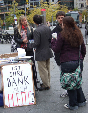 ![]() EIRNS/James Rea Europeans are beginning to face the fact that they are not immune from the effects of the global financial meltdown. Shown, members of the LaRouche Youth Movement organize in Berlin. The sign says, “Is your bank also bankrupt?” |