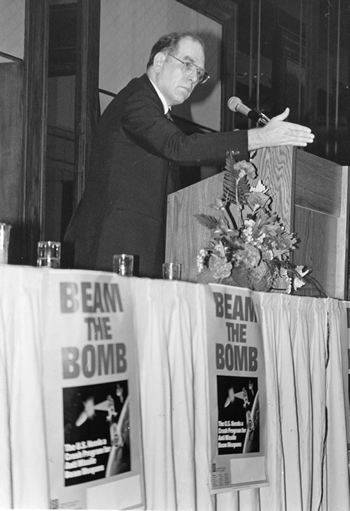 Lyndon LaRouche addresses a conference on “beam weapons” in Washington, April 13, 1983. The Strategic Defense Initiative (SDI) was his operation, and President Reagan accepted it. It was sabotaged, however, by dumb politicians and British agents, including those in Moscow. |