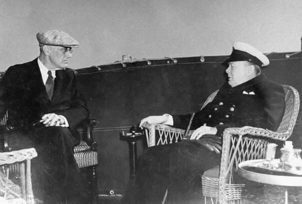 President Franklin Roosevelt and Prime Minister Winston Churchill aboard a warship at the Yalta summit, February 1945. With the end of the war in sight, the fundamental conflict between the two men loomed large: FDR was determined to destroy the British imperial system. |