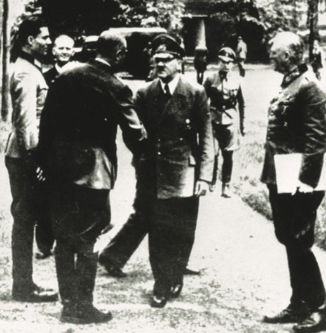 | French Marshal Philippe Pétain greets Adolf Hitler. The French made a deal with the Nazis, allowing the Wehrmacht to march into France. The British, who had expected Hitler to move East, screamed, “We were double-crossed!” and begged the U.S. for help. | German Federal Archive Col. Claus Schenk von Graf Stauffenberg (left) with Hitler, five days before the July 20, 1944 attempt by Stauffenberg and others to assassinate the Führer. They had made contact with the Allies about a peace settlement, but were betrayed by the British. On the right is Field Marshal Wilhelm Keitel, who played a key role in foiling the plot. |