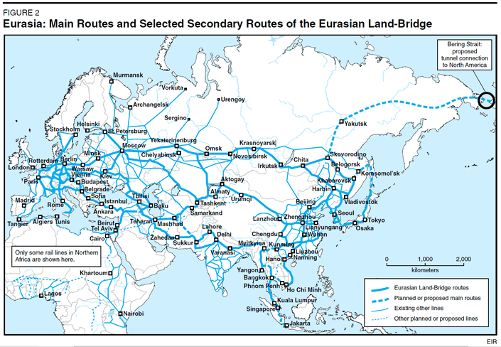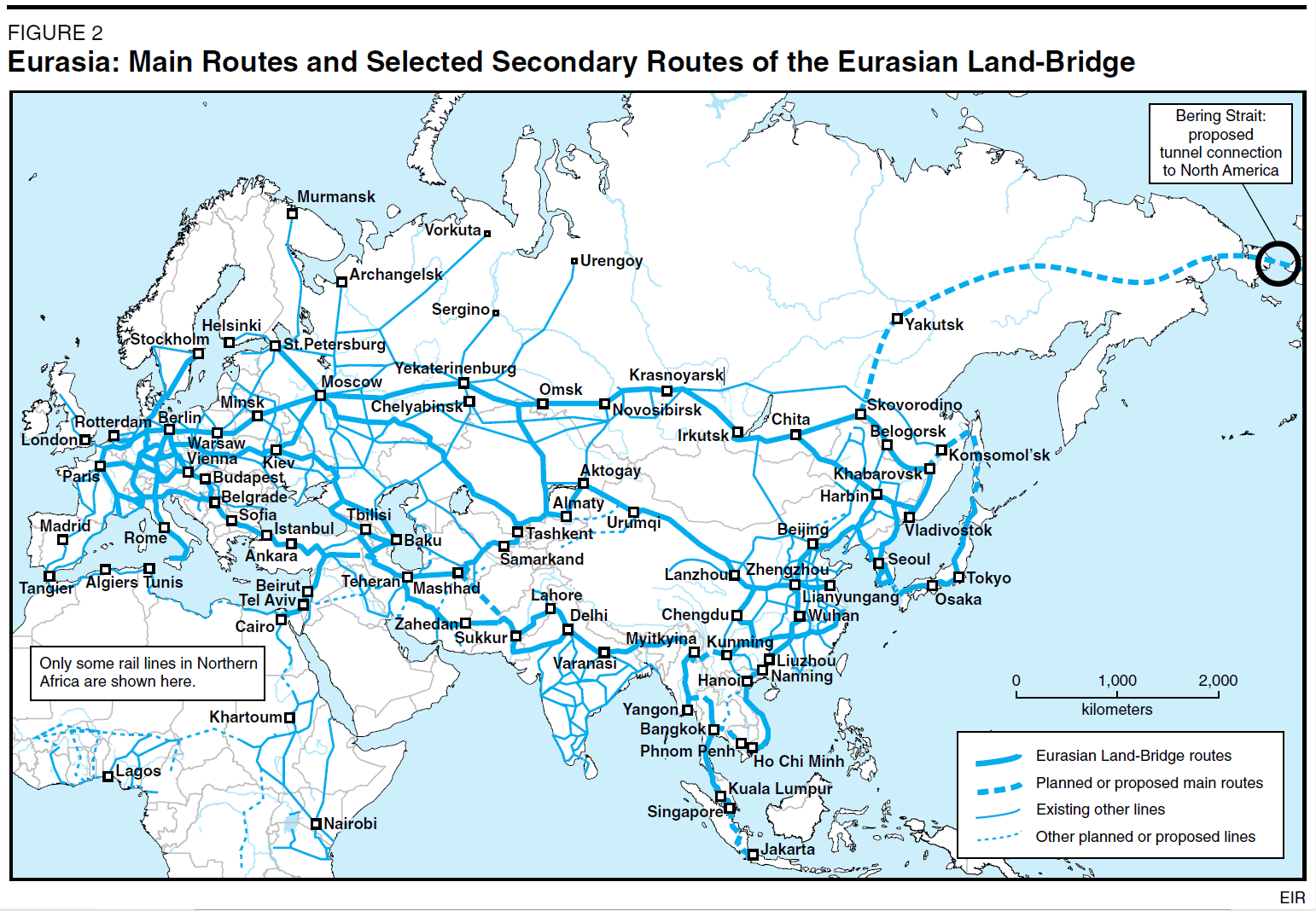 This (Figure 2) is a plan for the Eurasian Land-Bridge, which wethe Schiller Instituteproposed in 1991 after the Soviet Union had broken up, and which was conceived as a strategy for peace in the 21st Century, in which infrastructure corridors from Europe to Asia would be built.