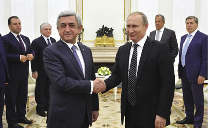 Grand Design for stabilizing the entire Central Asian region: (above) Russian President Vladimir Putin (right) shaking hands with President of Armenia Serzh Sargsyan at a joint news conference in the Kremlin, Aug. 10, 2016. |