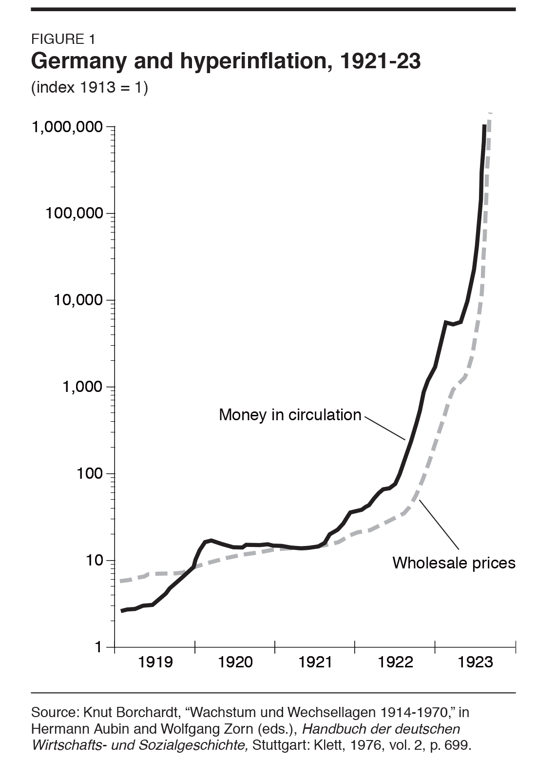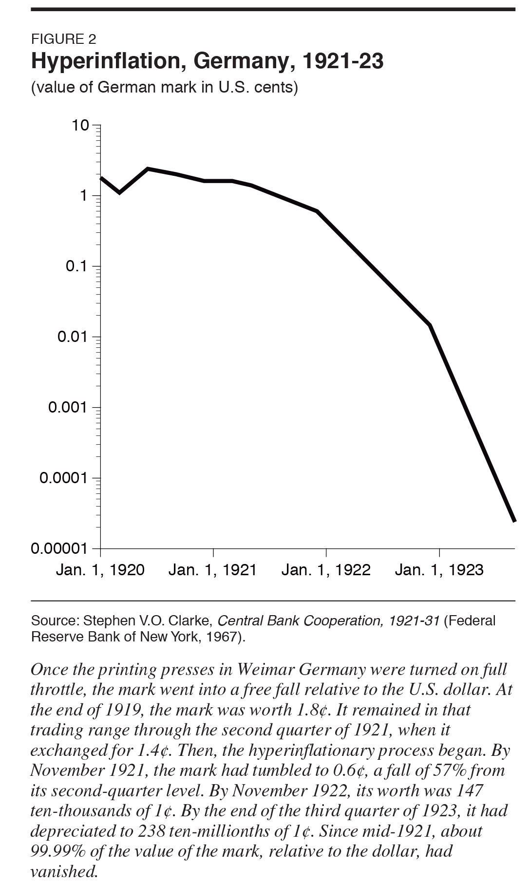 Meanwhile, as if to show us that matters were not already as bad as they might become, the policies demanded by both thuggish U.S. Federal Reserve Chairman Alan Greenspan and IMF Managing Director Michel Camdessus, for example, have already begun what threatens to become, very quickly, a hyperinflationary spiral, like that which struck Weimar Germany during 1922-1923 [Figures 1 and 2]. The difference is, that, if this Weimar-1923-style policy of Greenspan and Camdessus were continued throughout Asia, and into the oncoming explosions in Russia, and South America, the result must be a Weimar-style hyperinflation, which might reach total breakdown, world-wide, not over months, as in 1922-1923, but, because of the added impact of a global, $100 trillions-equivalent “derivatives” bubble, compressed into a period as short as weeks.
