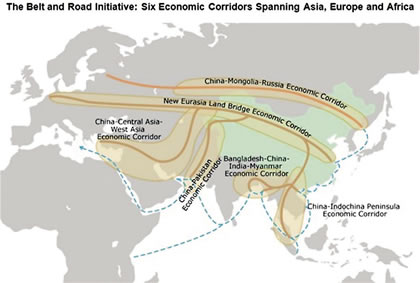 The Belt and Road Initiative: six economic corridors spanning Asia, Europe and Africa. |