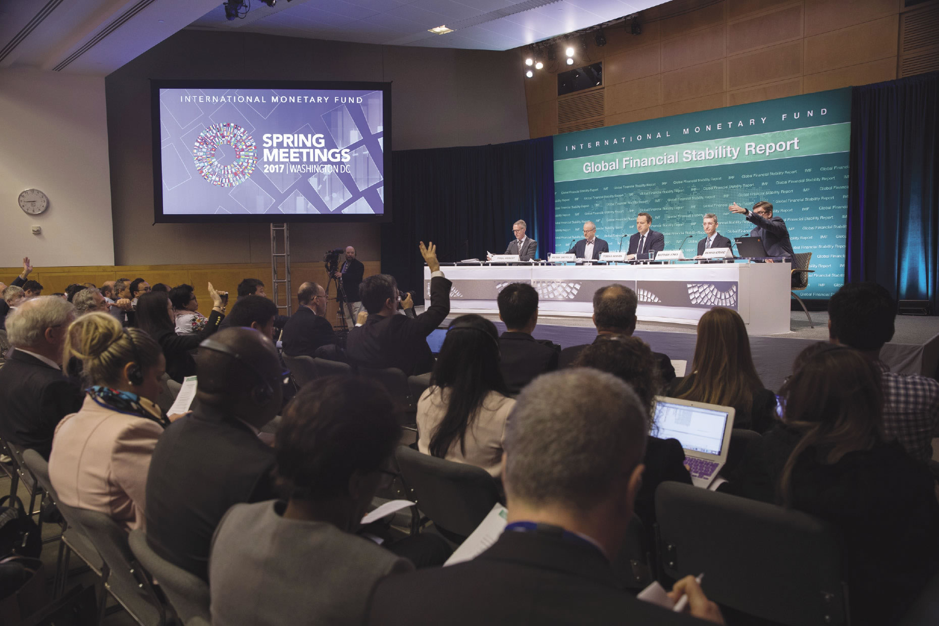 International Monetary Fund representatives present the Global Financial Stability Report at a press briefing during the IMF’s 2017 Spring Meeting. |