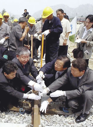 June 15, 2003 ceremony linking North and South Korea rail lines. |