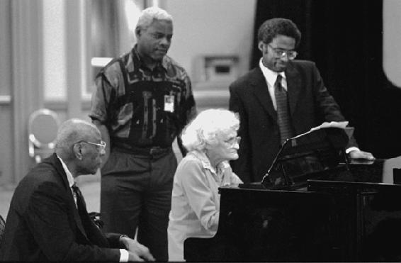 Schiller Institute Sylvia Olden Lee working with friends at the Sept. 1, 2001 ICLC/Schiller Institute Conference in Reston, Virginia. From left to right: William Warfield, Dorceal Duckens, and Dennis Speed. |