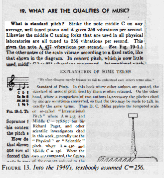 In fact, A=440 has never been the international standard pitch, and the first international conference to impose A=440, which failed, was organized by Nazi Propaganda Minister Joseph Goebbels in 1939. Throughout the seventeeth, eighteenth, and nineteenth centuries, and in fact into the 1940s, all standard U.S. and European text books on physics, sound, and music took as a given the ``physical pitch'' or ``scientific pitch'' of C=256, including Helmholtz's own texts themselves. Figures 13 and 14 show pages from two standard modern American textbooks, a 1931 standard phonetics text, and the official 1944 physics manual of the U.S. War Department, which begin with the standard definition of musical pitch as C=256.[1]
