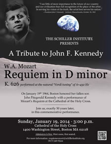 On Sunday, January 19, 1964 a performance was given of Mozart's Requiem Mass in Boston honoring the recently assassinated John F. Kennedy. The Mozart had been specifically requested by his widow, Jacqueline Kennedy. And on January 19, 2014 the Schiller Institute will present another performance of the Mozart Requiem in memory of president Kennedy--50 years later, to the day---at the Cathedral of the Holy Cross in Boston. This event will honor Kennedy's legacy of inspiration, especially in young people, of the patriotism and soaring idealism which produced the Apollo moon project and the Peace Corps and the entire climate of hope and confidence associated with Kennedy's Presidency.