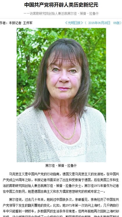 Guangming (Enlightenment) Daily published an interview with Schiller Institute founder Helga Zepp-LaRouche on June 26th the occasion of the 95th anniversary of the founding of the Chinese Communist Party, an event which has been the focus of a great deal of media attention in the country. In the interview Mrs. Zepp-LaRouche relates the tremendous changes she has seen in China since her 1971 visit to the country as a young journalist during the Cultural Revolution. She underlines in particular the importance of the Silk Road Economic Belt Initiative for China, and for the world, regarding it as the type of relationship between China and Europe which Gottfried Wilhelm Leibniz tried to establish during the 17th century. In this manner China, in realizing its “China Dream” of the revival of the Chinese nation, also transforms it into a “World Dream”. Mrs. Zepp-LaRouche also praises the policy of the Chinese Communist Party under President Xi Jinping in making science the basis of the “people’s welfare” and pushing the boundaries of science toward new breakthroughs, in the fields of “the structure of matter, the evolution of the universe, the origin of life, and the nature of consciousness”, as President Xi underlined. With breakthroughs in these fields, she stressed, China will define a new paradigm in thinking and a new era in human history.