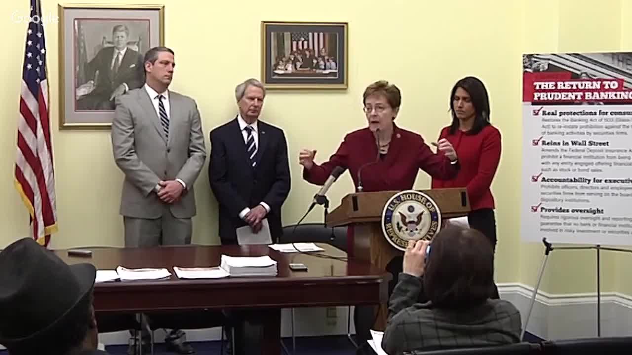 View full size![]() Left to right: Rep. Tim Ryan (D-OH), Rep. Walter Jones (R-NC), Rep. Marcy Kaptur (D-OH), Rep. Tulsi Gabbard (D-HI) in press conference promoting re-instatement of Glass-Steagall, February 1, 2017. |