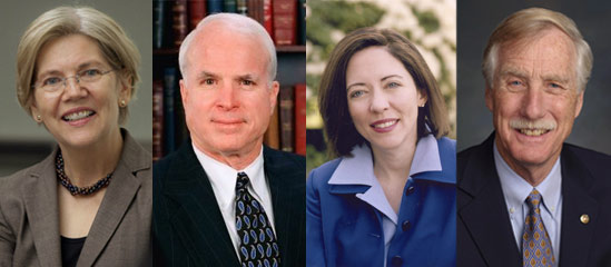 ![]() Left to right: U.S. Senators Elizabeth Warren (D-Massachusetts), John McCain (R-Arizona), Maria Cantwell (D-Washington), and Angus King (I-Maine).