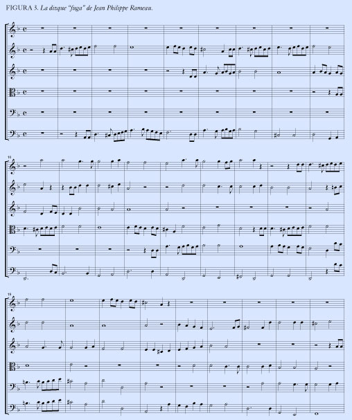 La primera impresión es que suena bien, y Rameau, que tiene la habilidad de crear efectos sonoros armónicos y de introducir pequeñas imitaciones de contrapunto, puede engañarte. Pero no es una fuga, porque no hay diálogo, no hay tensión entre las voces. lo que no es de extrañar, porque en la teoría de Rameau las voces no tienen una existencia real; en esencia, éstas entran después de terminado el esbozo básico de la composición para llenar los espacios entre los acordes, como Chopin señaló.