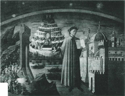 Un cono invertido imaginario superimpuesto a la escena, con el vértice en el punto donde el compás de Arquímedes se posa en la pizarra, nos sugiere una espiral que conectaría los rostros y las manos de los jóvenes que participan en la clase. No son éstos recipientes pasivos de información fija, sino que cada individuo absorbe y trasmite la clase a los que van llegando. Esto ilustra el tercer nivel de contrucción espacial en la pintura, el supremo, basado directamente en los descubrimientos de Leonardo da Vinci. La Divina Comedia de dante Alighieri El punto de referencia más eficiente de este progreso en la ciencia de la pintura es el método popularizado en la Divina Comedia por Dante Alighieri, que aparece en la figura 2, iluminando la ciudad de Florencia con su poema, escrito en las dos primeras décadas del siglo 15. A la izquierda, en el centro y en el cielo detrás de él, se representan los tres cánticos de la Divina Comedia, la épica, escrita en italiano vernáculo, del viaje de un hombre vivo, Dante mismo, por el mundo de la otra vida, donde el alma de cada individuo es objeto de la justicia divina.