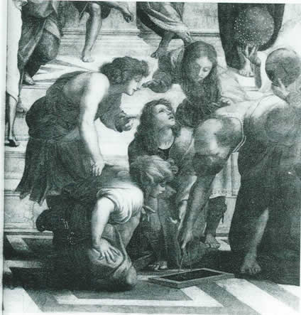 Sólo se han conservado doce pinturas auténticas de Leonardo, y muchas de ellas no están terminadas. Le correspondió en gran medida a un artista de la generación siguiente, Rafael Sanzio, nacido en 1483, aplicar los conocimientos de Leonardo. El Arquímedes de Rafael que aparece en la figura 1c no es sólo una figura más de la “Escuela de Atenas”; lo que está haciendo en realidad es crear la pintura en la que aparece; porque, corrigiendo el escorzo, podemos sobreponer el dibujo de la pizarra de Arquímedes a las ortogonales de la arquitectura que está detrás de las figuras que representan a la ciencia física en el fresco (figura 12a).