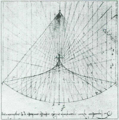 En un dibujo de principios de la década de 1490 (figura 11b), Leonardo da esbozos de una construcción albertiana de un gran salón y una doble hélice desenrollándose, que nos recuerda sus observaciones sobre las pautas de autoorganización de los flujos de agua y el autodesarrollo de las formas vivas. En otra parte escribió, refiriéndose a la perspectiva: “Tal como una piedra lanzada al agua deviene el centro y la causa de muchos círculos, y como el sonido mismo se difunde en círculos en el aire, así cualquier objeto, colocado en la luminosa atmósfera, se difunde también en círculos y llena el aire circundante con imágenes infinitas de sí mismo. Y se repite el todo en todas partes, y el todo en cada una de la más pequeña de las partículas”.(*3) Leonardo no abandonó la perspectiva del punto único sino que la tranformó estudiando las áreas de ambiguedad formadas por las cáusticas, como se ilustra en la figura 11c, formadas por familias de curvas que se intersecan. Esto nos lleva al dominio matemático que Leibniz llamó luego trascendental. En lugar de concentrarse en el rayo central, dedicó su atención a los fenómenos que ocurren en la periferia de la visión, especialmente según los afecta la atmósfera.