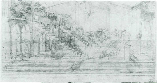 En el estudio preparatorio del mismo tema (figura 8b), Leonardo demostró su dominio del esquema albertiniano trazando una intrincadísima red de ortogonales que convergen en un punto de fuga único. El problema de esa perspectiva es que por sí misma no puede dar cuenta de lo que es lo más importante: el cambio de fase de una geometría inferior a una superior.