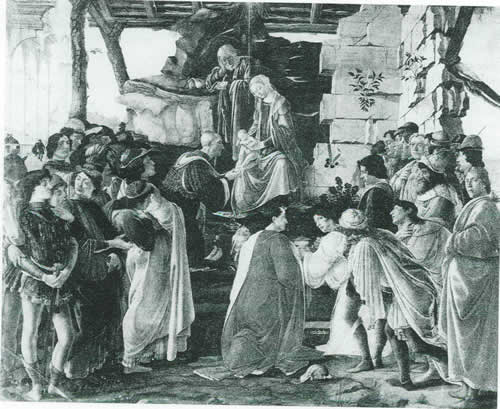 Esta limitación se expresa involuntariamente en un tratado teórico sobre la perspectiva en la pintura escrito a mediados del siglo 15 en Italia. El autor, Piero della Francesca, afirma que la pintura consta de tres elementos: color, dibujo y la disminución de las formas en el espacio, siendo solamente esta última la que puede ser tratada científicamente. El autor trata con gran desprecio a cualquier artista que no domine y, en verdad, haga progresar la ciencia de la perspectiva. Sin embargo, como Leonardo se daría cuenta, la perspectiva es la ciencia de la visión, y, por lo tanto, debe comprender todos los aspectos del universo visual. En su tratado de pintura, Leonardo teorizó en forma completa sobre tres tipos de perspectiva: la perspectiva del color, la de la forma y la de la disminución. No vivimos en un espacio euclidiano sin aire, en el que un solo ojo recibe líneas rectas que no se doblan ni se refractan. Más aún, las figuras humanas y animales no permanecen como cilindros y esferas en ese espacio cristalino, sino que, por supuesto, se mueven. Sandro Boticelli, un artista un poco más viejo de la generación de Leonardo, se había enfrentado a este problema. En su “Adoración de los Reyes Magos” (Figura 9), Boticelli presenta un conjunto de figuras en el que dominan los miembros de la familia Médeci, que gobernaba extraoficialmente a Florencia, y a todas convergiendo hacia la Sagrada familia, ubicada bajo el cobertizo de un pesebre perfectamente construido de acuerdo con las reglas albertianas. Pero, a pesar del colorido de los vestidos y de las posturas animadas de los individuos , la pintura permanece estática. En verdad, comparada con la “Adoración” de su contemporáneo Leonardo, la figura central, el Niño Jesús bendiciendo al más viejo de los Magos, es tan pequeña que cuesta trabajo distinguirlo.