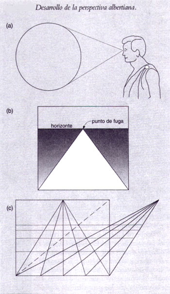El descubrimiento de Brunelleschi vino a conocerse, por eso, como perspectiva albertiana. Este tipo de construcción se le puede enseñar fácilmente a los niños y debiera incluirse de nuevo en los planes de enseñanza de nuestros días. Brunelleschi y Alberti simplificaron la visión a un solo ojo e imaginaron que los rayos de luz entran al ojo, que es un receptor pasivo, en un cono o piramide (Figura 7a). Cada línea atraviesa en un solo punto el plano de la pintura, interpuesto entre los objetos tridimensionales y el ojo, lo que permite así un proceso de proyección ordenado y coherente. La figura 7b muestra el punto de fuga único, correspondiente al ojo, que se hubica en el horizonte de la representación pictórica. Todas las ortogonales del objeto o la escena que se representa convergen en ese punto. En la figura 7c, vemos cómo, en la perspectiva albertiana, una serie de líneas se proyecta en el plano desde el original tridimensional. Nótese que las características topológicas --como el número de bordes y esquinasse mantienen, pero la forma se deforma según la distancia y el ángulo del plano interpuesto respecto al observador. Dichas modificaciones se llaman escorzo.