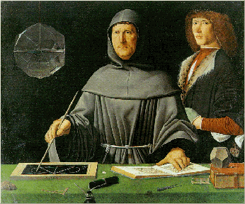 La pintura está construida según los principios de la perspectiva artificial, logro por el cual la pintura se elevó de arte mecánica a ciencia en el siglo 15. A diferencia del ejemplo gótico, el cuadro está compuesto a modo de expresar los descubrimientos que celebra. Gracias a la aplicación de la geometría proyectiva, el espacio tridimensional se ha representado de modo convincente en una superficie de dos dimensiones.. Pacioli, discípulo del gran pintor renacentista Piero della Francesca, no era un artista. Fue el matemático profesional que colaboró con Leonardo Da Vinci en el libro La Divina proporción, en la década de 1490. Este retrato inortaliza el descubrimiento de Pacioli de que la proporción que él llamó divina y que hoy se conoce, en forma menos precisa, como sección áurea es una expresión única de la acción espiral autosemejante en el universo, característica de los seres vivos. Pero este concepto aún no se representa adecuadamente en el cuadro, que presenta un agregado casi inmóvil de particulares en un espacio fijo. Por ejemplo, el estudiante o ayudante de pacioli no toma parte real en la escasa acción. El tercer ejemplo, la figura 1c, es de 1510, apenas unos cuantos años después. Es el retrato que hizo Rafael Sanzio del físico matemático griego Arquímides haciendo una demostración de geometría.(*1) Aunque la pintura tiene vida propia, en realidad es un detalle del fresco “La escuela de Atenas”, pintado en el Vaticano, visión cristiana de las contribuciones de la ciencia griega clásica pagana.