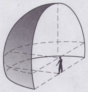 Rafael imaginó el salón como si los diferentes grupos de grandes pensadores se proyectaran en el interior, curvado negativamente, de una esfera. La figura 12c muestra un cuadrante esférico en el cual una figura se ubica en medio de la esfera; ello corresponde a la perspectiva de la Stanza della Signatura. En la bóveda se representan los conceptos que unen a esos campos del conocimiento humano.