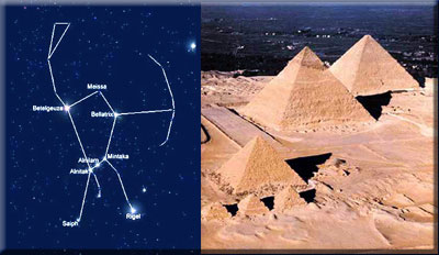 ¿Qué hay sobre el suelo de la meseta de Gizeh? La Esfinge y las tres principales pirámides. La Esfinge Un león con cabeza de hombre mira hacia el Este, justo hacia la constelación de Leo, que salía poco antes del alba en el equinoccio vernal de alrededor del 10000 a.C. (la mayoría de las culturas antiguas, incluyendo la egipcia, la china y la india, dividieron las constelaciones del Zodíaco aquellas en el plano eclíptico de manera sorprendentemente uniforme. El león, el escorpión, el carnero, el toro, etc.. aparecen en la mayorIa de ellas). Las tres pirámides, aunque una al lado de las otras, no están alineadas entre ellas. Si dibujas una línea sobre la cima de las dos primeras pirámides, la tercera estaría un poco desviada. Ahora observa el cinturón de Orión: dibuja una línea sobre las dos estrellas más brillantes del cinturón, y verás que la tercera, la más “pequeña”, esta un poco desviada, igual que la tercera pirámide.