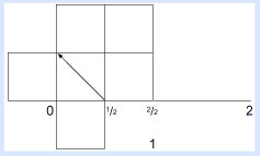 Regresemos a nuestro primer cuadrado, con sus dos pequeños cuadrados en el "punto cero" y con nuestra diagonal que va del punto 1/2 en la parte inferior al punto 1/2 del lado izquierdo.