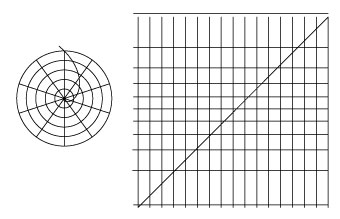 La proyección de Mercator corresponde a una transformación de círculos y líneas radiales distribuidos de forma homogénea en un entramado de líneas. Los radios se transforman en líneas verticales distribuidas de forma homogénea, y los círculos en líneas horizontales distribuidas de modo exponencial. Esto corresponde al inverso de la exponencial compleja, también conocida como el logaritmo complejo (ver figura 8). Para proyectar una esfera sobre un plano, Gauss aplicó estas transformaciones complejas a los modos de determinación de una esfera, esto es, a los dos modos de rotación.