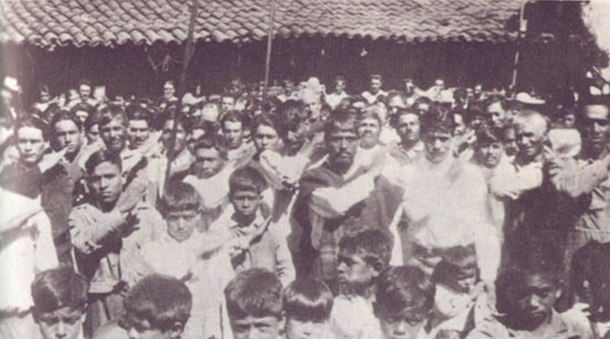 Luego de la Declaración de Independencia de 1810, la de otra forma positiva Constitución de Apatzingán de 1814 proclamó al catolicismo como la única religión reconocida, y restauró las órdenes religiosas suprimidas por los Borbones. Según Meyer: "Las guerra de la Reforma (1857, 1867 y 1876), y el anticlericalismo de la Constituyente de 1917, la persecución que se dio entre 1926 y 1938, y las rebeliones cristeras en el mismo período, todos estos hechos fueron consecuencia de la política regalista de los Borbones". Además sostiene que las disposiciones de Lerdo de Tejada de 1859, "provocaron la insurrección de los religioneros, un movimiento semejante a la Vendée y al carlismo español". Señala además que el intento por establecer un Estado nacional soberano basado en el modelo estadounidense era ajeno a la tradición hispana. Según Meyer: "El México moderno ha sido formado por hombres que despreciaban al antiguo México. En gran medida, esta fue la raíz del conflicto que enfrentó al nacionalista Calles contra los patrióticos cristeros". Así, el supuesto básico de Meyer es que la soberanía nacional es ajena a la "tradición hispana", "patriota", como se refleja en la rebelión de los "religioneros" contra la Reforma y la insurrección cristera contra la Revolución Mexicana. Asimismo, Meyer compara explícitamente la rebelión de los religioneros con el carlismo español. Es muy dicente también que al final del libro Meyer escribe: "Algunos han interpretado esta guerra como un movimiento similar al de Salazar o Franco, como precursora del sinarquismo, una variante mexicana del fascismo". Por supuesto, según Meyer ese no es el caso. Para Meyer, el sinarquismo es un movimiento fundado en México en 1937. El único nexo que está dispuesto a reconocer entre los cristeros y el sinarquismo es que, según él, el fracaso de los primeros dio paso a los segundos, y posteriormente al PAN. Pero la verdad es que la insurrección cristera fue la precursora directa del movimiento sinarquista oficial en México. La ciudad de Guadalajara y el estado de Jalisco fueron los baluartes, tanto de los cristeros, como de la Unión Nacional Sinarquista. Hasta la fecha, Guadalajara es un centro del sinarquismo a favor de los cristeros. Meyer sostiene su tesis fraudulenta omitiendo cualquier referencia a los agentes jesuitas decisivos que participaron en la formación de los cristeros desde principios de los 1890, y el papel de estos mismos jesuitas en la posterior creación del sinarquismo mexicano en los 1930. El principal agente jesuita que omite es a Bernardo Bergöend, a pesar de que gran parte de los antecedentes sobre él que aparecen en este artículo derivan directamente de los libros que el mismo Meyer recomienda en su bibliografía. Como se detalla más adelante, Bergöend, quien primero pasó de Francia a México en 1891, por más de tres décadas fue decisivo en sembrar las semillas que más tarde produjeron la insurrección cristera. Al mismo tiempo, como documenta el libro El PAN, cuando concluyó la insurrección cristera en 1929 Bergöend encabezó a los intransigentes que rehusaron aceptar la política de reconciliación del Vaticano. También ayudó a fundar la Liga de la O, también conocida como la OCA (Organización–Cooperación–Acción), que mantuvo una resistencia armada. La OCA recoge al núcleo de militantes cristeros quienes, en los 1930, pasarían a formar la Unión Nacional Sinarquista.Las raíces sinarquistas de la rebelión cristera![]() Jóvenes cristeros, en la ciudad de Morelia, México La insurrección cristera de 1926–1929 fue la continuación de las insurrecciones "religiosas" contra la Reforma de Juárez y Lerdo de Tejada, inspiradas en las guerras carlistas del siglo 19 en España, llevadas a la práctica por la oligarquía europea. Los carlistas defendían la política de la Santa Alianza: monarquía absoluta, despotismo feudal y rechazo a todo lo que semejase una república federal soberana. Antes de la Revolución Mexicana de 1910, cuando el presidente Porfirio Díaz aún estaba en el poder, el sacerdote jesuita José Luis Cuevas lanzó un movimiento de Acción Católica sinarquista, con la formación de una Unión de Católicos Mexicana, para hombres, y la Unión Femenina Católica Mexicana. Esto llevó al Primer Congreso Católico en febrero de 1903, en la ciudad de Puebla. Uno de los delegados, un joven abogado de Jalisco, Miguel Palomar y Vizcarra, propuso la creación de un banco cooperativo rural. Posteriormente hubo congresos católicos en Morelia en 1904, en Guadalajara en 1906 y en Oaxaca en 1909. A la par, se realizaron congresos rurales en Tulancingo en 1904 y 1905, y en Zamora en 1906. Entre los dirigentes de los congresos, además del padre Cuevas y Palomar, estaban el laico José Refugio Galindo; un sacerdote josefino, José María Troncoso; el juesuita francés Bernardo Bergöend; y el obispo de Tulancingo, José Mora y del Río, quien posteriormente fue nombrado arzobispo de México. Bernardo Bergöend fue la personalidad decisiva que, no sólo formó el sinarquista movimiento de Acción Católica que condujo a la insurrección cristera, sino que también, cuando concluyó la guerra, continuó con el proceso que llevó a la creación oficial del movimiento sinarquista. Bergöend nació en Francia en 1871 e ingresó a la Compañía de Jesús a los 18 años de edad. A los 20, en 1891, fue enviado a México, donde cursó estudios en San Luis Potosí. En 1900 fue enviado a estudiar teología a España. Luego pasó a San Luis, Misurí, en los EU, donde se ordenó sacerdote. De ahí regresó a México, donde ocupó varios cargos en Puebla y en México, D.F., antes de que lo nombraran profesor de filosofía en el Instituto Jesuita de Guadalajara. In 1905 José Refugio Galindo fundó el grupo de Operarios Guadalupanos. En 1908, el padre José María Troncoso fundó la Unión Católica Obrera. En 1906, Bergöend organizó los primeros