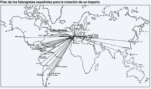 Según Chase, Hitler nombró al general Wilhelm von Faupel como jefe del Instituto Iberoamericano en Berlín. Von Faupel ya tenía mucha experiencia en Iberoamerica. En 1911, se integró al equipo docente del Colegio de Guerra de Argentina en Buenos Aires; en 1921, después de la Primera Guerra Mundial, fue asesor del Inspector General del Ejército argentino; en 1926, ocupaba un alto cargo en el Ejército brasileño, y luego ese mismo año llegó a ser Inspector General del Ejército peruano. Asimismo, tenía vínculos estrechos con Fritz von Thyssen e IG Farben, y estaba convencido de que la llave para dominar a América Latina era España. Los nazis dividieron a Iberoamérica en cinco divisiones: 1) Argentina, Uruguay y Paraguay; 2) Brazil; 3) Chile y Bolivia; 4) Perú, Ecuador, Colombia y Venezuela; y 5) Panamá, América Central y México. A fin de dominar América Latina a través de España, tenían que aplastar a la República española. Por tanto, el Tercer Reich conspiró con oficiales del Ejército español para llevar a Franco al poder. Faupel decidió trabajar a través de la Falange de José Antonio Primo de Rivera, cuyas teorías sociales promovería Fernando Quijano en los 1990. Berlín le dio sus principios a la Falange, entre ellos: "Tenemos la voluntad de un imperio y afirmamos que el legado histórico de España es el imperio. . . En cuanto a los países Latinoamericanos, nos proponemos estrechar los vínculos de la cultura, los intereses económicos y del poder, España sostiene que es el arbol espirtual del mundo español como reconocimiento de sus empresas universales. Nuestro Estado será un instrumento totalitario al servicio del país. . . Nadie participará a través de los partidos políticos. La línea del partido será eliminada sin misericordia. Desde el punto de vista económico nos imaginamos a España como un sindicato de productores gigantesco. Repudiamos el sistema capitalista.. . . Tambien repudiamos el marxismo. . . Nuestro movimiento encarna un sentido de vida católico la tradición gloriosa y predominante en España y lo incorporaremos a la reconstrucción nacional". Los nazis organizaron el golpe de Franco de principio a fin. Después, von Faupel creó la Falange Exterior, la división hispanoparlante de la Organización Extranjera del partaido nazi alemán. El 18 de noviembre de 1936, la ejecución de Primo de Rivera le dio a la Falange un martir.