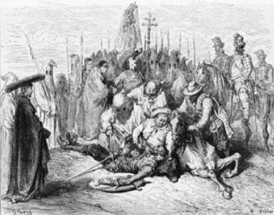 Era el caso que aquel año habían las nubes negado su rocío a la tierra, y por todos los lugares de aquella comarca se hacían procesiones, rogativas y diciplinas, pidiendo a Dios abriese las manos de su misericordia y les lloviese; y para este efecto la gente de una aldea que allí junto estaba venía en procesión a una devota ermita que en un recuesto de aquel valle había. Don Quijote, que vio los estraños trajes de los diciplinantes, sin pasarle por la memoria las muchas veces que los había de haber visto, se imaginó que era cosa de aventura, y que a él solo tocaba, como a caballero andante, el acometerla; y confirmóle más esta imaginación pensar que una imagen que traían cubierta de luto fuese alguna principal señora que llevaban por fuerza aquellos follones y descomedidos malandrines; y como esto le cayó en las mientes, con gran ligereza arremetió a Rocinante, que paciendo andaba, quitándole del arzón el freno y el adarga, y en un punto le enfrenó; y pidiendo a Sancho su espada, subió sobre Rocinante, y embrazó su adarga, y dijo en alta voz a todos los que presentes estaban: