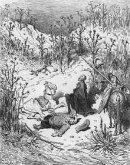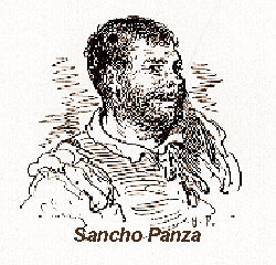 El primero, es la reacción de Sancho Panza al ver a su amo tendido en el suelo tras haber sido vapuleado por un grupo de disciplinantes religiosos, a quienes don Quijote había atacado, creyéndolos secuestradores.