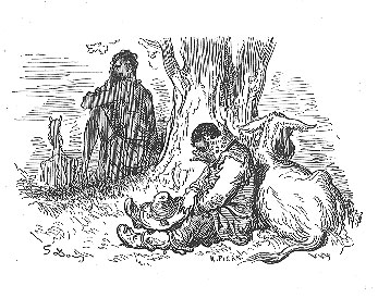 Socorra vuestra merced, señor caballero, por la virtud que Dios le dio, a mi pobre padre; que dos malos hombres le están moliendo como a cibera.
