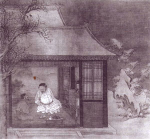 En “los dos patriarcas armonizando sus mentes” de Shi Ke (periodo de las Cinco Dinastías), el carácter diferente de los dos sujetos se expresa a través del uso del pincel y la variación en la “humedad” de la tinta. Un método similar, aunque más simplificado, es usado por Liang Kai en “Li Bai cantando un poema”, pintado cientos de años antes, durante el periodo Song.