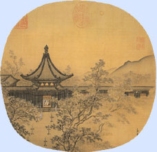 (Nota (*10).- Nótese el uso de la luz. En la pintura china, uno no encuentra recursos sencillos de iluminación, y hay muy poca diferencia entre el día y las escenas nocturnas. Además de oscurecer el ambiente, el pintor usará diferentes signos para ilustrar el hecho de que está oscureciendo. En esta pintura, la luna, las lámparas, el lago, y la luz tenue en el interior del pabellón, se unen para crear una impresión nocturna) Siguiendo el principio de “aplicar colores de acuerdo a la especie”, un famoso pintor de la Dinastía Song, Guo Xi, aconseja sobre la naturaleza de las montañas y el agua: “las montañas primaverales están brillantemente adornadas y parecen sonreír. En verano están frondosas y verdes, llenas de humedad. En otoño las montañas son brillantes, muy adornadas. En invierno las montañas son frías y desoladas, como si dormitaran”. Y: “el agua de primavera es verde, el agua de verano es verde jade, el agua de otoño es azul, y en invierno es blanca”. ¿Cómo es la naturaleza del cielo? “Deslumbrante en primavera, azul brillante en verano, claro en otoño y oscuro en invierno”. La belleza de la tinta depende del pincelado, de ahí el dicho: “el pincel canta y la tinta baila”. Con el magistral uso del pincel, se pueden crear toda la gama de tonalidades entre los seis colores (seco, húmedo, grueso, delgado, negro y blanco) ó, como lo expresa un antiguo dicho: “la maestría en el uso de la tinta presenta un tono verde; pero el pincel produce un ocre. Cuando nada lo impide, la tinta aparecerá en los colores y los colores en la tinta”.
