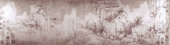 Como último ejemplo, vean el hermoso paisaje de Huang Gongwang, “Despejándose tras la repentina nevada”. [ver figura A5]. Con la excepción del rojo sol invernal, sólo ha utilizado tinta. La ejecución de las montañas las ha logrado con un pincel muy suave (quizá una pluma) y aún así, se muestran monumentales, los desnudos árboles en oscura y pálida tinta según la profundidad de la escena.