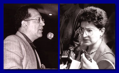 Ellos rompieron con LaRouche en el 2000 y el 2003, respectivamente, y siguen coordinando operaciones en su contra en Iberoamérica. Quijano en la conferencia de fundación del MSIA en Tlaxcala, en 1992 (izq.); y Carrasco en una conferencia de prensa en Washington, en 1986, en la que presentó un libro denunciando al Partido Acción Nacional (PAN) de México como “el partido de la traición” (der.), accción de la que ahora abjura.