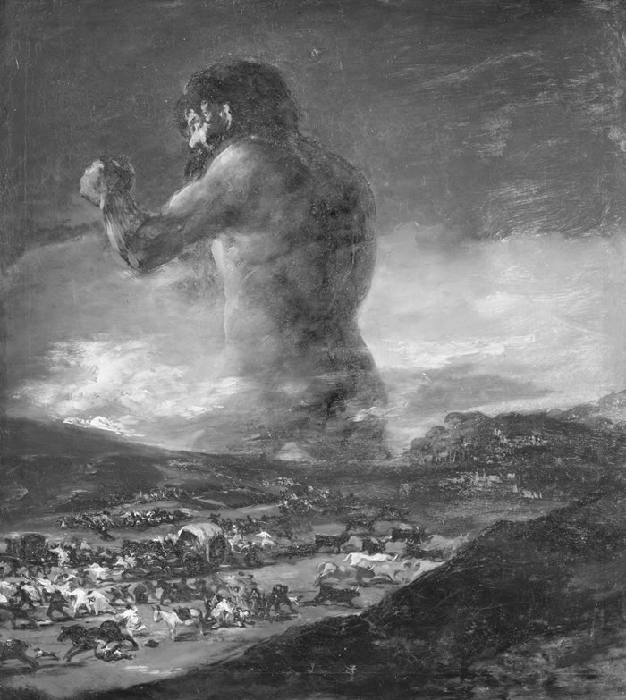 Para apreciar de modo más directo el genio político y artístico de Goya y tener idea de su poderoso sentido de identidad histórica mundial, miremos el “Coloso”, sin duda una de las obras más representativas de su perspectiva, llamada originalmente El Gigante. (6)