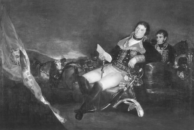 ![]() Figura 21. Francisco de Goya y Lucientes, "Manuel de Godoy", 1801. Godoy, el jóven guardaespaldas de la reina, fue promovido para tomar las riendas del reino. Godoy, que era conocido por sus aventuras sexuales, traicionó a los humanistas por órdenes de la Inquisición. En este retrato, hecho el mismo año que recibió el título de Generalísimo de los Ejércitos de Tierra y Mar, Goya sugiere donde yace su poder real, en las palabras de un biógrafo, "entre sus poderosos muslos, un bastón con mango nudoso se levanta." Goya, pone el trasero de un caballo, al lado de Godoy.. |