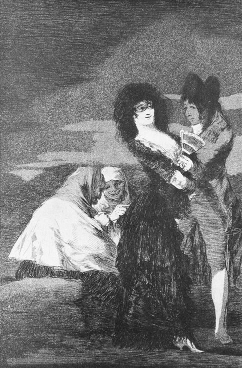 Goya se invita a la mascarada de su época, aunque sin dejarse engañar por las narices falsas, apariencias de las que él será el polvo picapica. No podemos entender su obra sin remitirnos al Don Giovanni de Mozart: se burla de la bufonería de los petimetres (del francés petits-maîtres, dandis franceses imitadores de las modas venecianas de la corte de Versalles), y de cómo, detrás de ésta vasta Comedia del Arte de costumbres galantes, se encuentran las intrigas brutales resueltas a golpe de puñal y veneno tan familiares a la nobleza degenerada, sin hablar de aquellos pobres tontos que trataron de imitarlos.