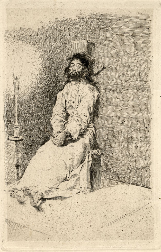 ![]() Figura 19. Francisco de Goya y Lucientes, "El agarrotado", aguafuerte, c. 1779. La Inquisición quemó a 35.000 personas en la hoguera, y torturó o castigó a 90.000 más. |